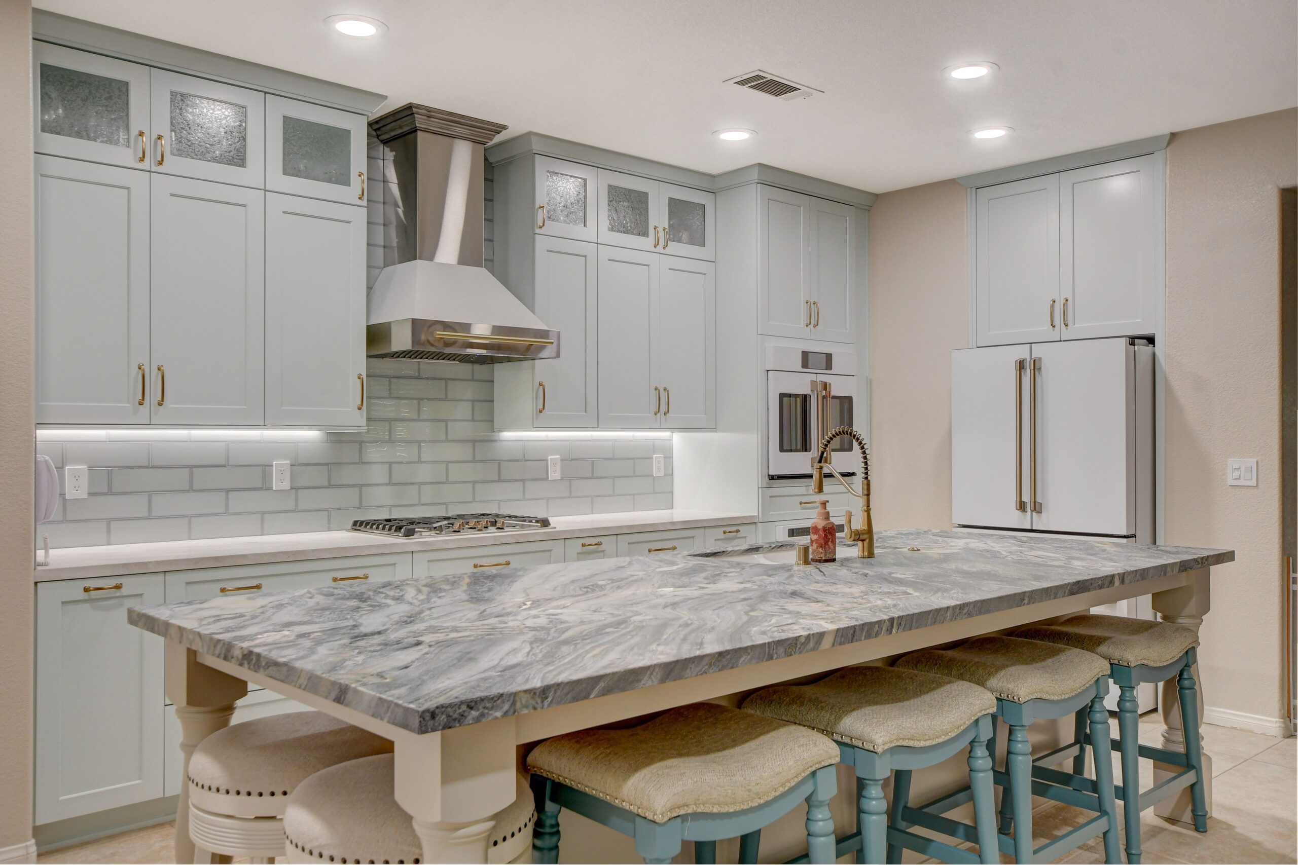 This Las Vegas home underwent a glamorous kitchen remodel checking off all of the items on the customer’s kitchen bucket list. We started by removing the kitchen cabinets, countertops, faucet, garbage disposal, sink, and appliances. Next, we installed Showplace EVO Sterling 275 Paint Grade cabinets with a Sherwin Williams 6476 Glimmer Satin finish, a custom color, to the perimeter cabinets. To top off perimeter cabinets, we used Sky White Honed quartzite. For the island cabinets, we installed Showplace EVO Sterling 275 Paint Grade Mocha Satin with Explosion Blue Polished quartzite. These cabinets include soft close doors and drawers, dovetail drawer boxes, stacked wall cabinets, a custom oven cabinet, a mixer lift door, a scoop drawer, cooktop, a knife block pullout, a tall drawer pullout, and a two 50 qt trash can pullout. The customer chose Arizona Tile Vetri Naturale Polished 4”x12” backsplash to go to the full height of the bottom of the cabinets and around the hood to the ceiling. To add an extra element of custom, we added Task Lighting to the cabinets, as well as satin nickel outlets. The customer provided, and we installed, the Café appliances to match the cabinets and plumbing fixtures. We replaced the existing sink with the cast iron white Kohler Brookfield undermount double equal bowl sink. To match the appliance hardware, we installed the Kraus Boldlen Semi-Professional spring faucet, air switch kit, and air gap all in brushed brass. Lastly, we replaced the garbage disposal with a Moen ¾. Overall, this kitchen turned out to be a showstopping custom kitchen remodel.