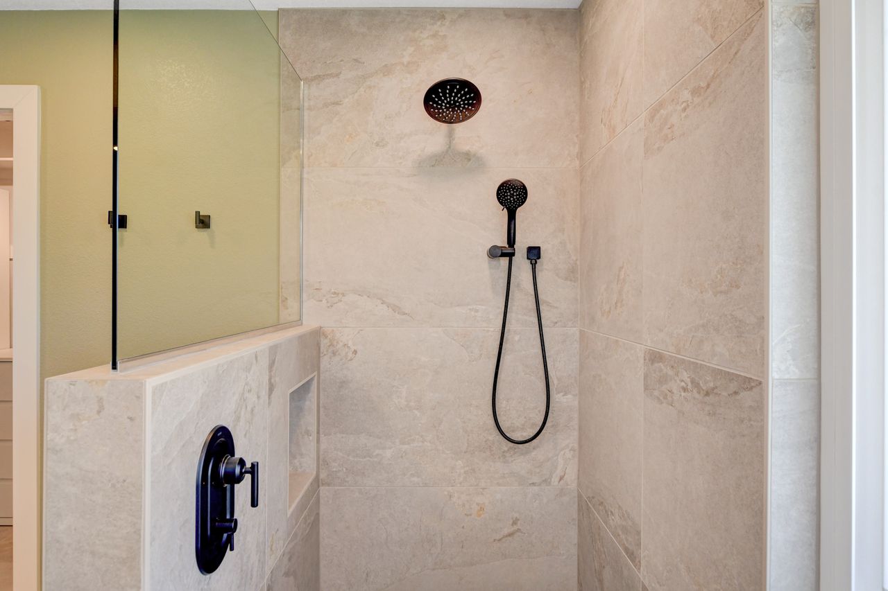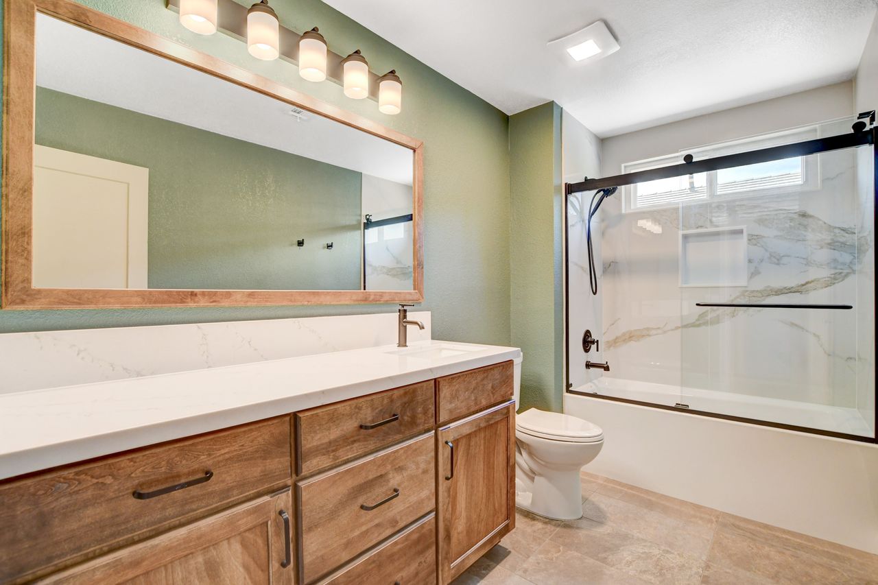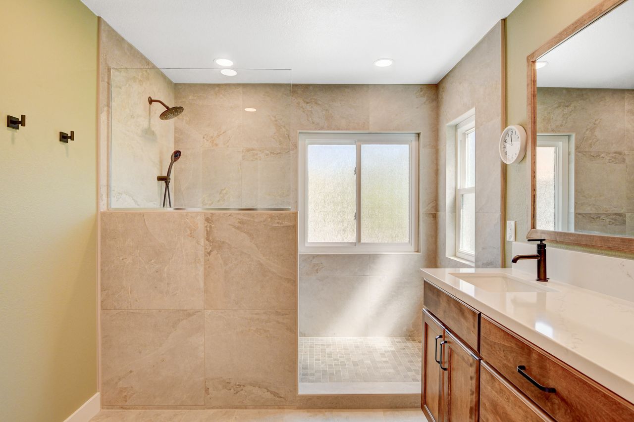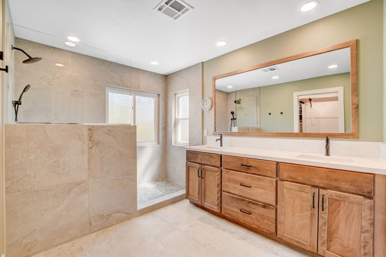 This home remodel in Henderson beautifully transformed two bathrooms into luxurious, functional spaces. The homeowners personally handled the demolition, allowing for a seamless start to the construction process with the master bathroom. They decided to remove the bathtub to create a larger shower area. This began with framing the new shower, which included a shampoo niche and a pony wall for the opening. After backerboarding and waterproofing, tiling commenced with selections from the Arizona Tile Canyon line of porcelain tiles. The expansive shower features Canyon Ivory in 24″x48″ tiles for the walls, curb, and shampoo niche, while Canyon Brown in 2″x2″ tiles accents the floor. To ensure a seamless transition from the shower to the bathroom floor, Canyon Ivory in a 12″x24″ format was used. A frameless 3/8″ clear glass over the pony wall maintains an open yet private feel. New cabinets in Koch Express Hartford 950 in Russet with Slab Drawer Fronts, coupled with MSI’s Calacatta Delios Quartz countertops, unify the space. The vanity mirror, framed in the same cabinet color, complements the design. Final touches include fresh paint, new baseboards, and matte black plumbing fixtures and handles.
