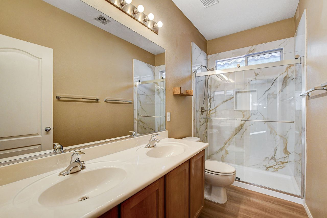 This Southern Highlands Hall Shower remodel completely transformed this space. We started with removing the original tub and shower surrounds. We framed for the new walk in shower and shampoo niche. After waterproofing we were ready to tile, we used MSI’s Porcelain Panel system in the color Calacatta Golden Mist which showcases deep gold and grey veining. Finishing touches for this job included new brushed nickel plumbing fixtures, a brand new sleek sliding glass shower door and brand new LVP flooring.