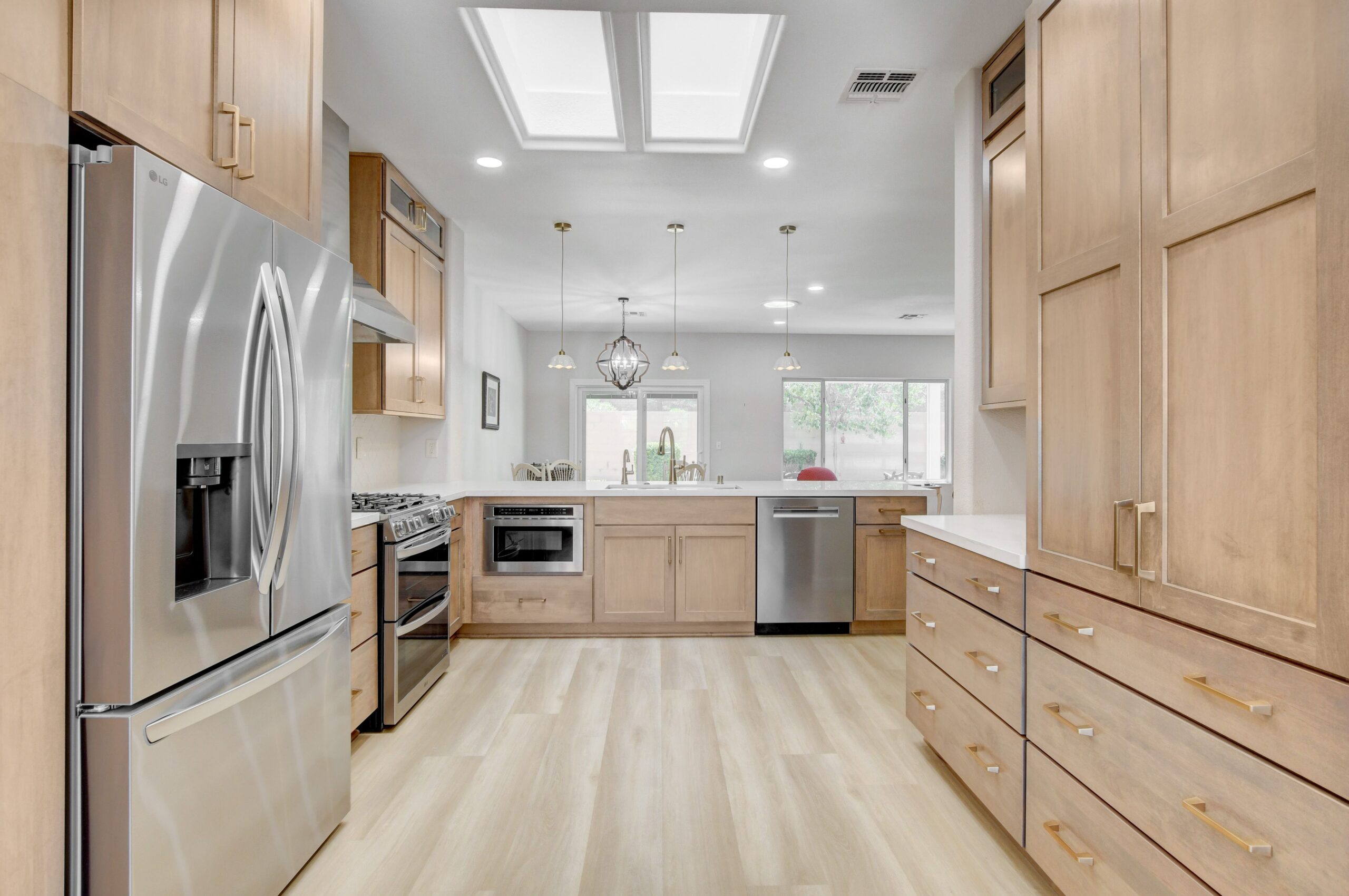 In this Kitchen, Laundry Room and Master Bathroom Remodel we started with the kitchen. Removing the existing cabinets, countertops, backsplash, sink and faucet. We also removed the pantry walls, door and shelving. Construction started with framing the new peninsula wall and extending a wall to fit the new cabinet design. We started with adding new custom Koch kitchen cabinets. We used Koch Classic Savannah 15 Shaker Maple Almond Satin with slab drawer fronts for all the perimeter cabinets. We added a custom desk area with Koch Classic Savannah 15 Shaker Paint Grade Evergreen fog to accent the space. All cabinets were topped with MSI’s Calacatta Abezzo Quartz slab. Finishing touches in the kitchen consisted of Ruvatis’s 36” Undermounted sink, Delta plumbing fixtures in champagne bronze, gold handles and MSI’s Antique White Arabesque backsplash.