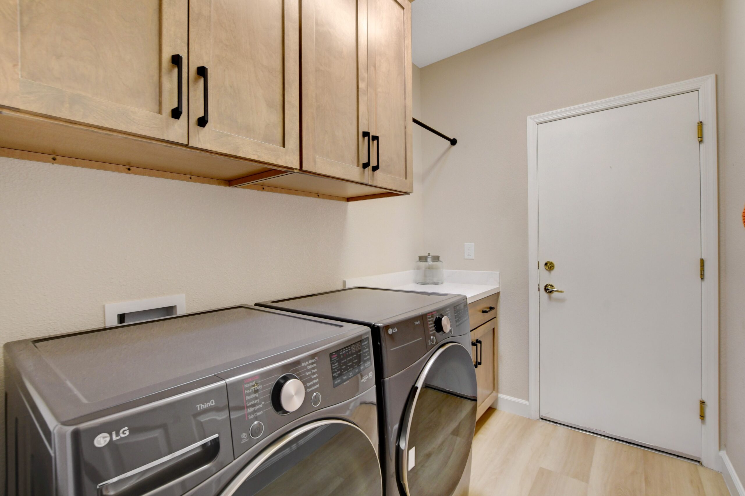 The Updates to the laundry room were minor but elevated this space immensely. We removed the existing wall cabinets and appliances. We installed custom cabinets, Koch Express Windsor 15 Shaker Birch Almond Satin with Slab Drawer front. Matching this countertop slab to the kitchen we used MSI Calacatta Abezzo quartz countertops.