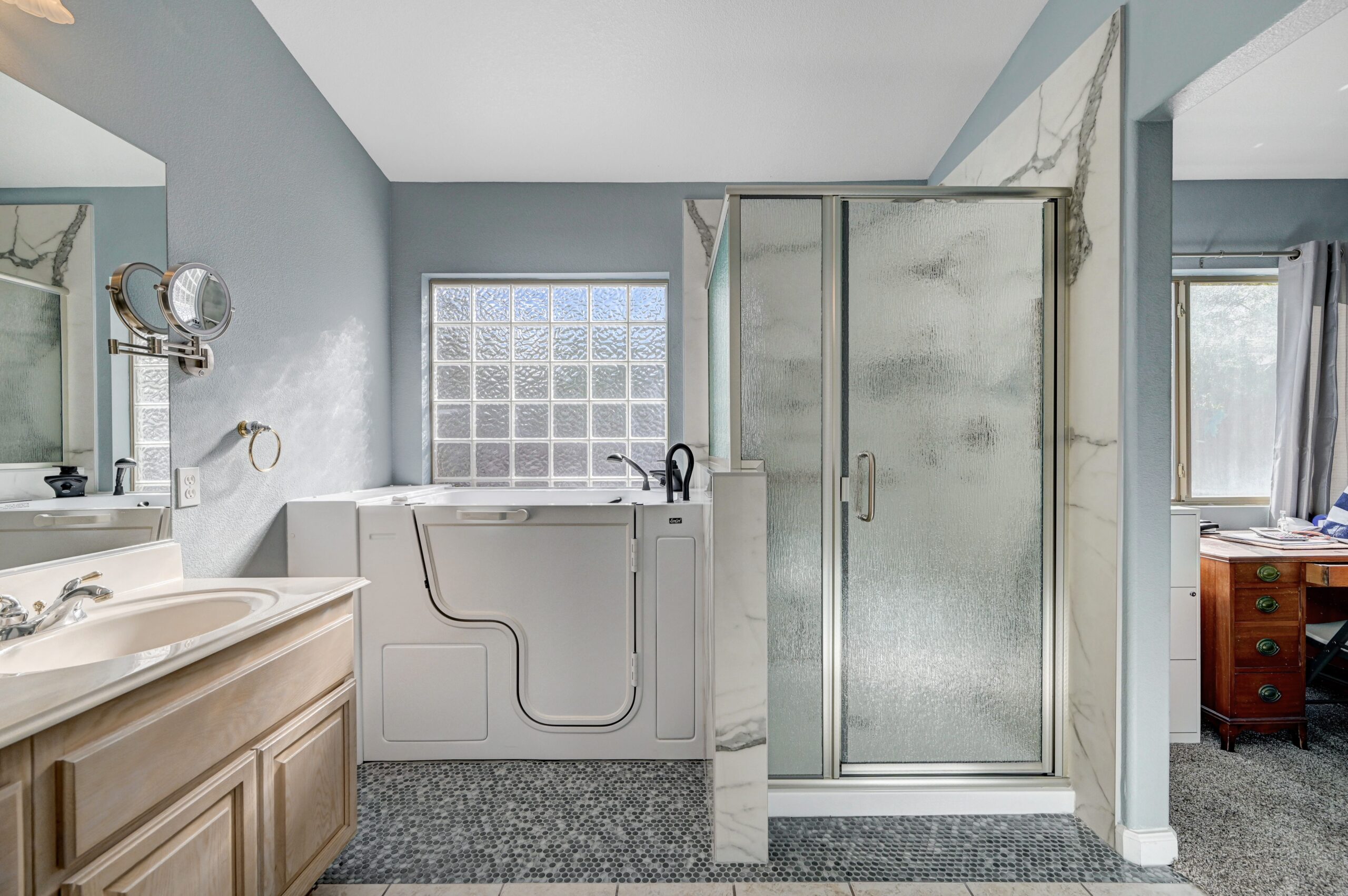 We started this Henderson Master Bathroom remodel with removing the existing shower, tub deck, bathtub and flooring around the areas. We reframed and re-waterproofed the areas. We also added additional framing to accommodate a Moen wall mounted foldable wood seat. We added extra backing for two 24” grab bars and an additional 18” grab bar. Building the new shower started with recentering the shower drain, shower valve and shower head. This shower head was also raised to 80” tall. The tub drain was also moved to accommodate a brand new Sanspa Walk in tub.
