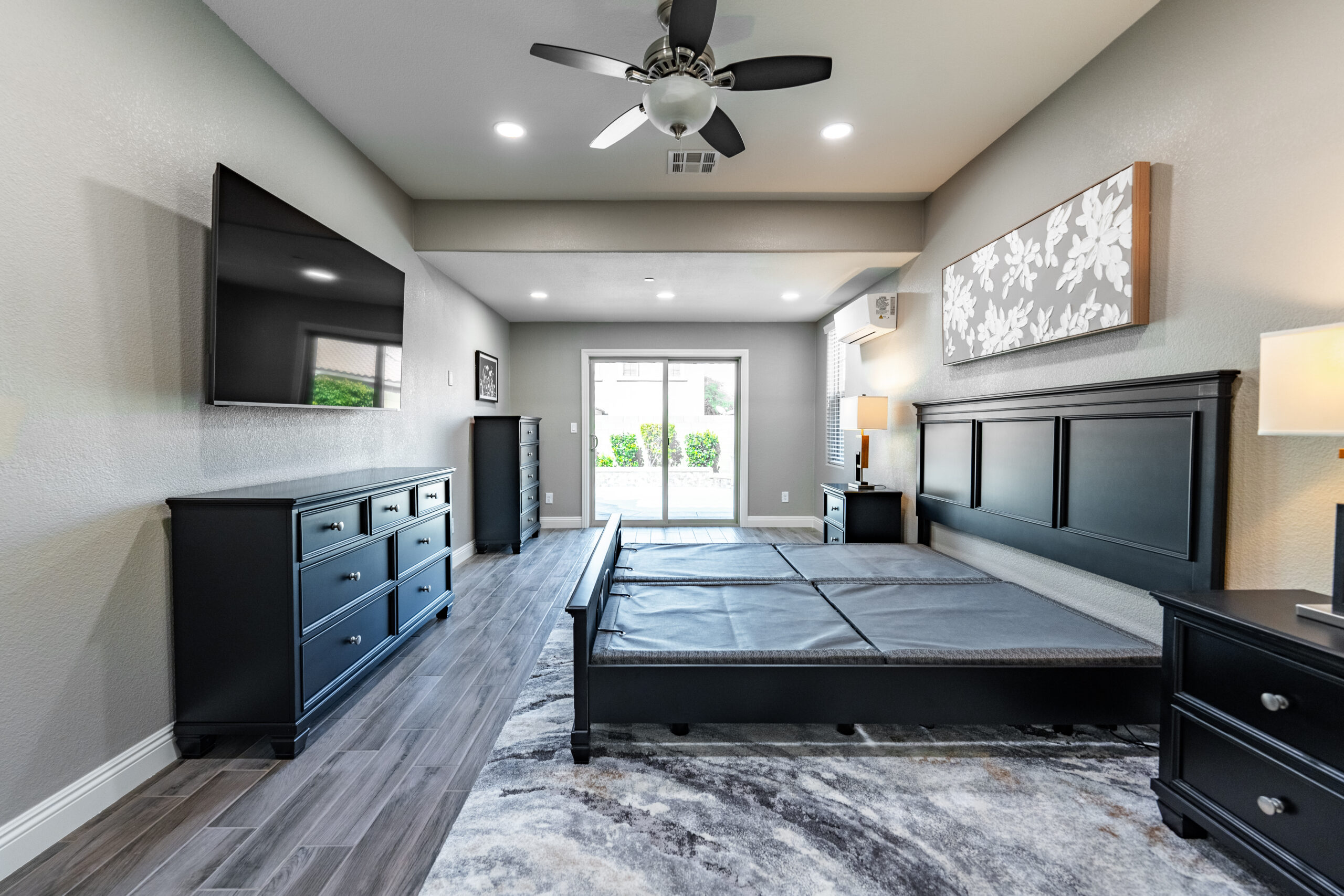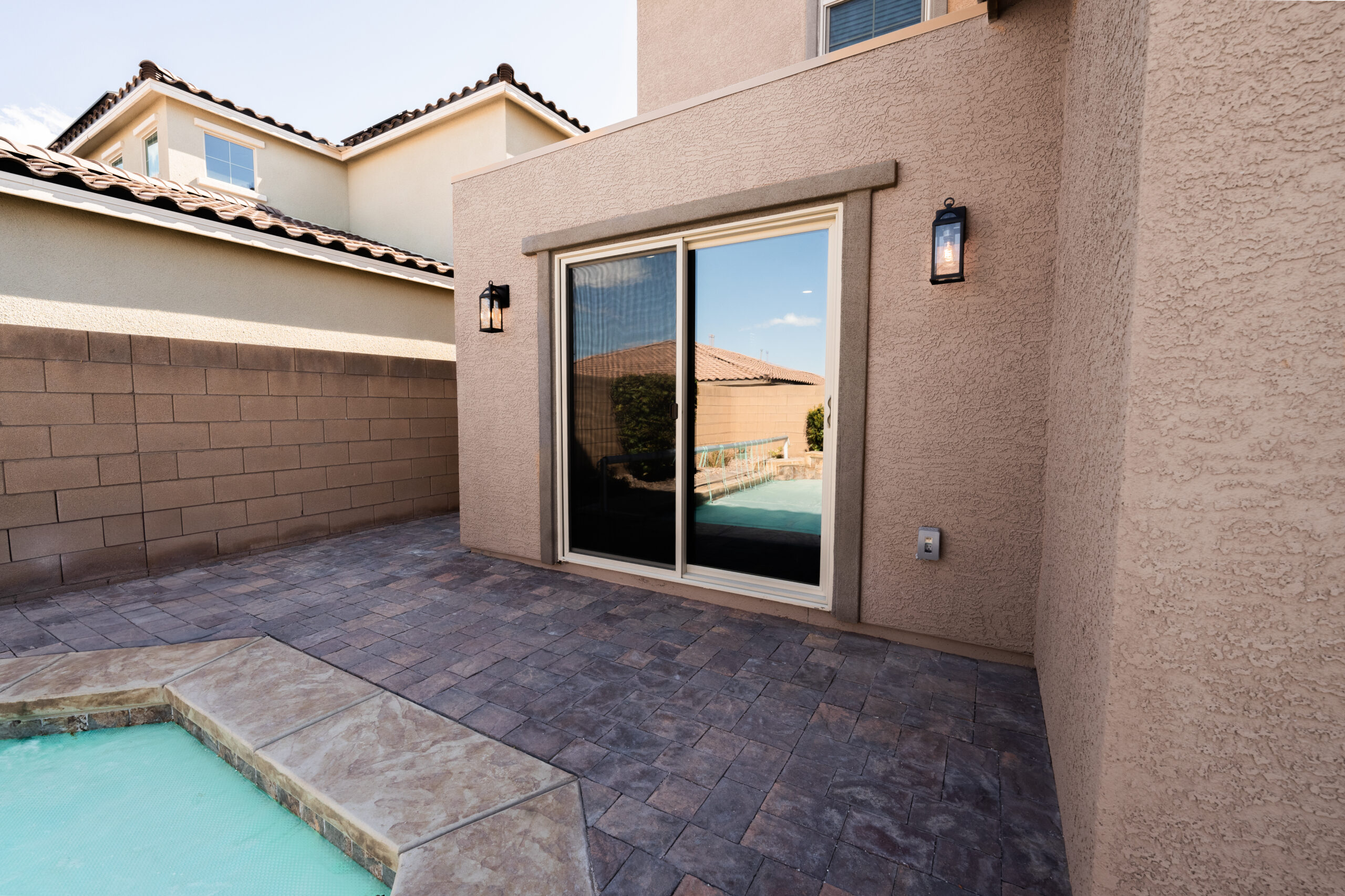 In this lovely Cadence home, we remodeled the hall bathroom as well as added a guest room to the home. After obtaining a building permit from the City of Henderson, we were able to start framing new exterior walls and roof for the 12’x8.5’ room addition. We framed a new 72’x96” sliding door, 1033 2 Lite Patio Door Desert Sand, at the old rear window location. Throughout the new bedroom, new closet, and remodeled bathroom, we installed Marazzi Norwood Oak 6”x24” tile with Mapei Ultracolor #145 Light Smoke grout.
