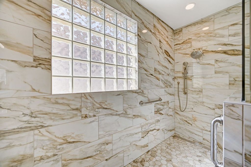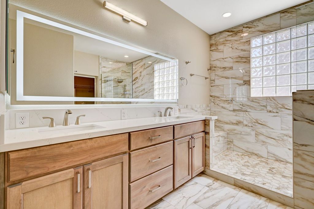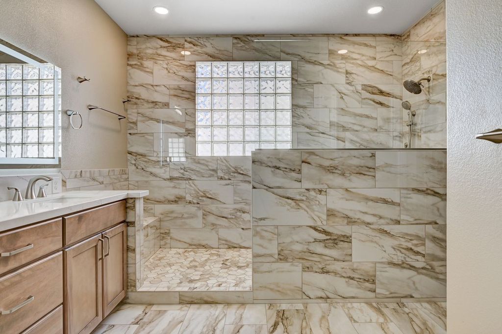 In this luxurious master bathroom remodel we started with removing the existing shower, bathtub, cabinets, countertops, flooring and baseboards. Construction started with framing the new shower allowing for additional framing for a diagonal shaving bench and 3 grab bars. After waterproofing the area we installed Arizona Tille’s True Marmi Gold Polished 12”x24” tiles along the shower walls and benches. Matching the walls, we used the Tru Marmi Gold Matte 4”x4” Hexagon tile. Opting out of a full shower door to create an open and welcoming space, we placed a frameless ⅜” rain glass over the long pony wall. Accenting the beautiful Tru Marmi Gold tiles we added in Birch Almond cabinets capped with an MSI Calacatta Delios quartz countertop slab. Matching the shower walls and floor we used Arizona Tile’s Tru Marmi Gold Matte 12”x24” tiles for the bathroom floor, creating the appearance of an endless shower in this bathroom.